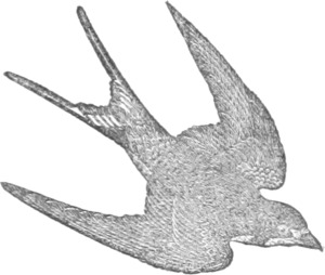 [A black and white image of a woodcut engraving of a single swallow in flight appears at the top left corner of an otherwise blank white screen.]