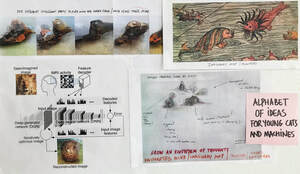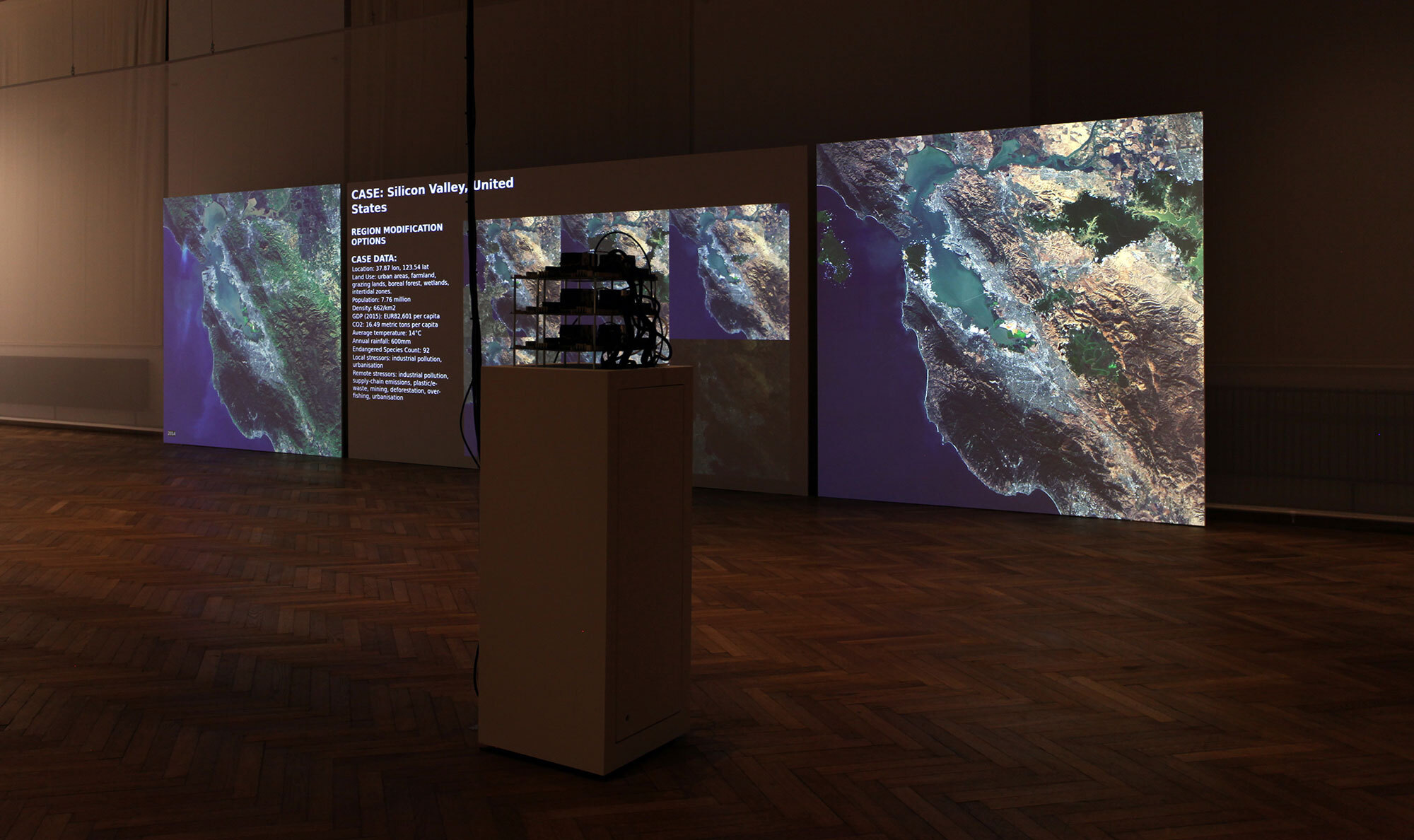 Another example is Tega Brain’s 2019 installation Asunder. Asunder is a three-channel video installation that speculates on the potentiality of climate interventions. In the installation, a neural network is used that has learned to generate imaginary satellite images according to certain parameters. Real-life satellite images are changed by this network to suggest radical geoengineering interventions: removing the city of San Francisco, planting trees in the desert, rerouting rivers. The resulting composite image is then fed into a scientific climate model, which runs on a high-performance computer in the exhibition space, and the resulting changes in the global climate are displayed. The work is relevant exactly because it puts the peculiar epistemic implications of GANs on their feet: the speculative nature of inverse problems is embraced, and utilized to project the ridiculous exit strategies that humankind still has left. The literal “alienated” perspective of machine learning systems is transformed into productive “alienation” in the Brechtian sense.